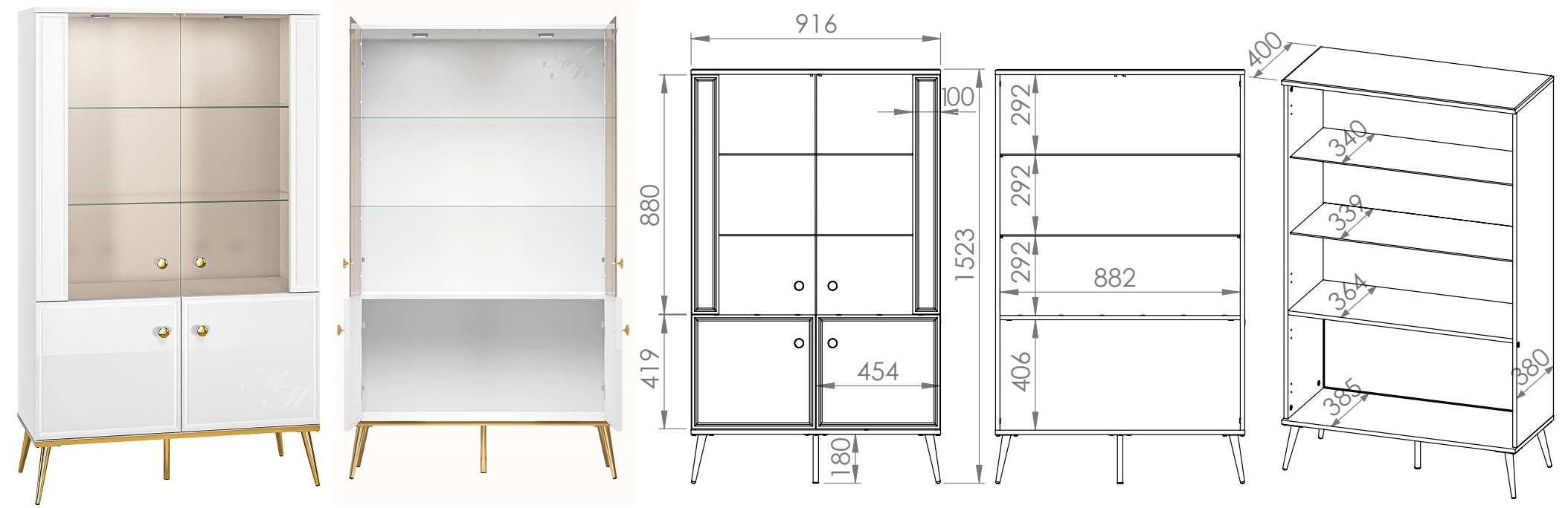• front oraz blat górny płyta MDF połysk (w szafie 01 i witrynie 02 blat górny matowy)